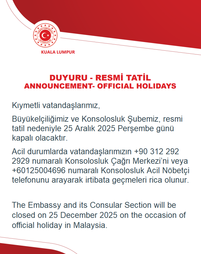 Büyükelçiliğimiz ve Konsolosluk Şubemiz, resmi tatil nedeniyle 25 Aralık 2025 Perşembe günü kapalı olacaktır.
